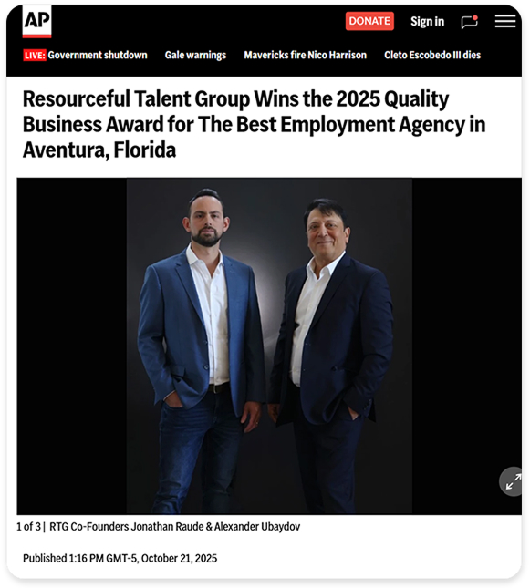 “Resourceful Talent Group (RTG), a premier boutique staffing and recruiting firm that delivers at scale, has been awarded the 2025 Quality Business Award for Best Employment Agency in Aventura, Florida. This honor, given to fewer than 1% of U.S. businesses each year, recognizes organizations that consistently demonstrate exceptional client satisfaction, service excellence, and measurable results.”